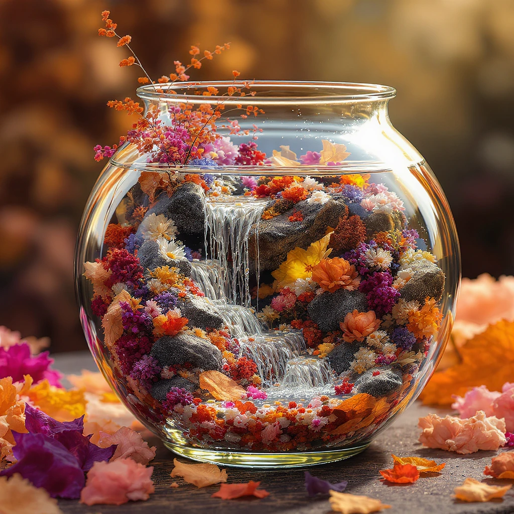 miniature art, a whimsical fishbowl, cascading potpourri waterfalls, hyper-realistic, soft focus, intricate details, warm ambient lighting, ethereal style, vivid colors of dried flowers and leaves, crystal-clear water reflections, ultra-detailed, high definition,