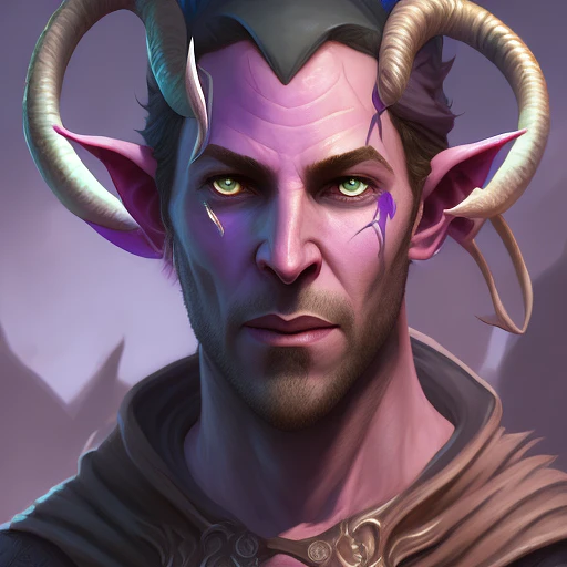 portrait painting of male magical tiefling rogue thief with lavender skintone and ram horns on the forehead, ultra realistic, concept art, intricate details, eerie, highly detailed, photorealistic, octane render, 8 k, unreal engine. art by artgerm and greg rutkowski and charlie bowater and magali villeneuve and alphonse mucha