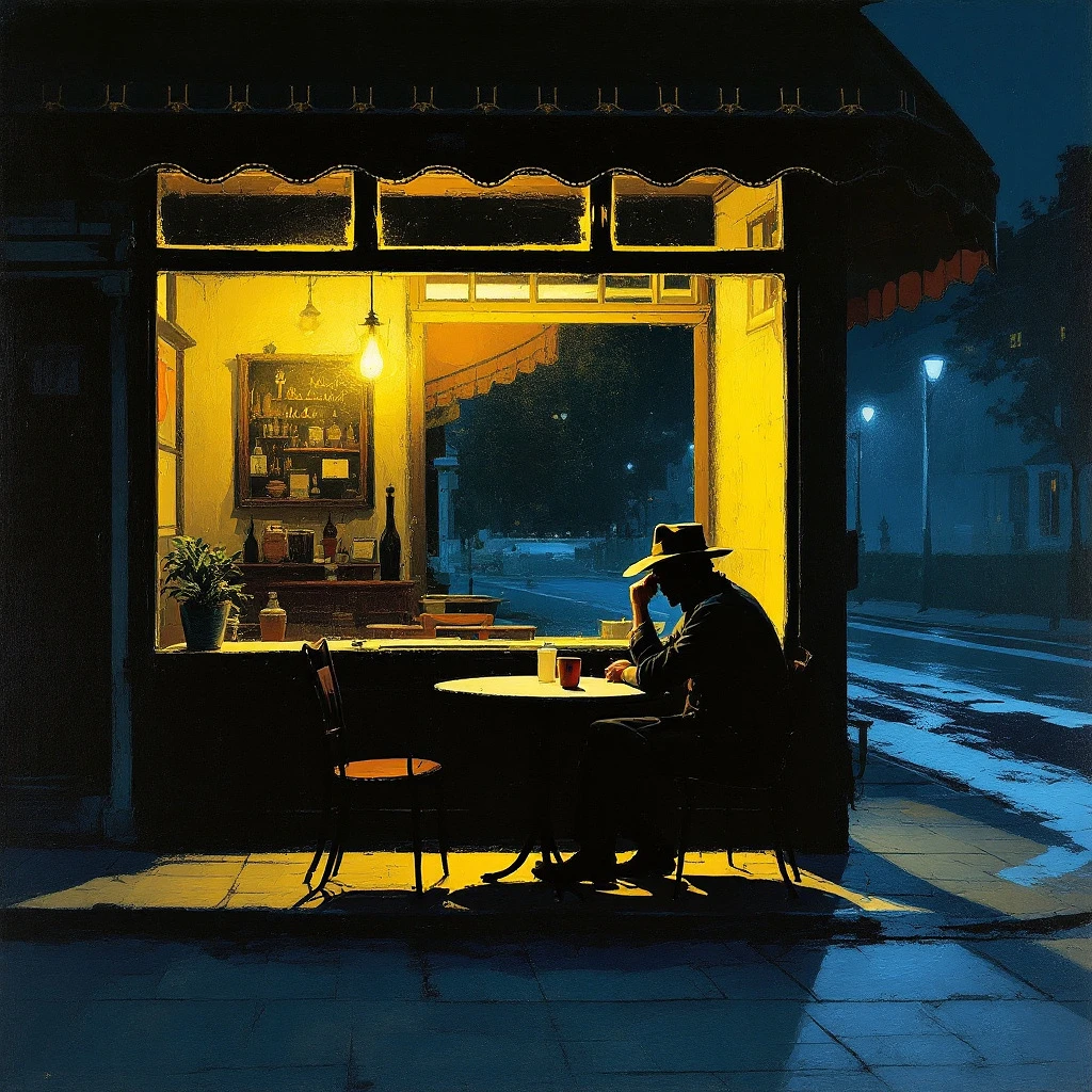 Edward Hopper style, shadows, windows, light, night, man sitting in cafe, man with hat, cowboy