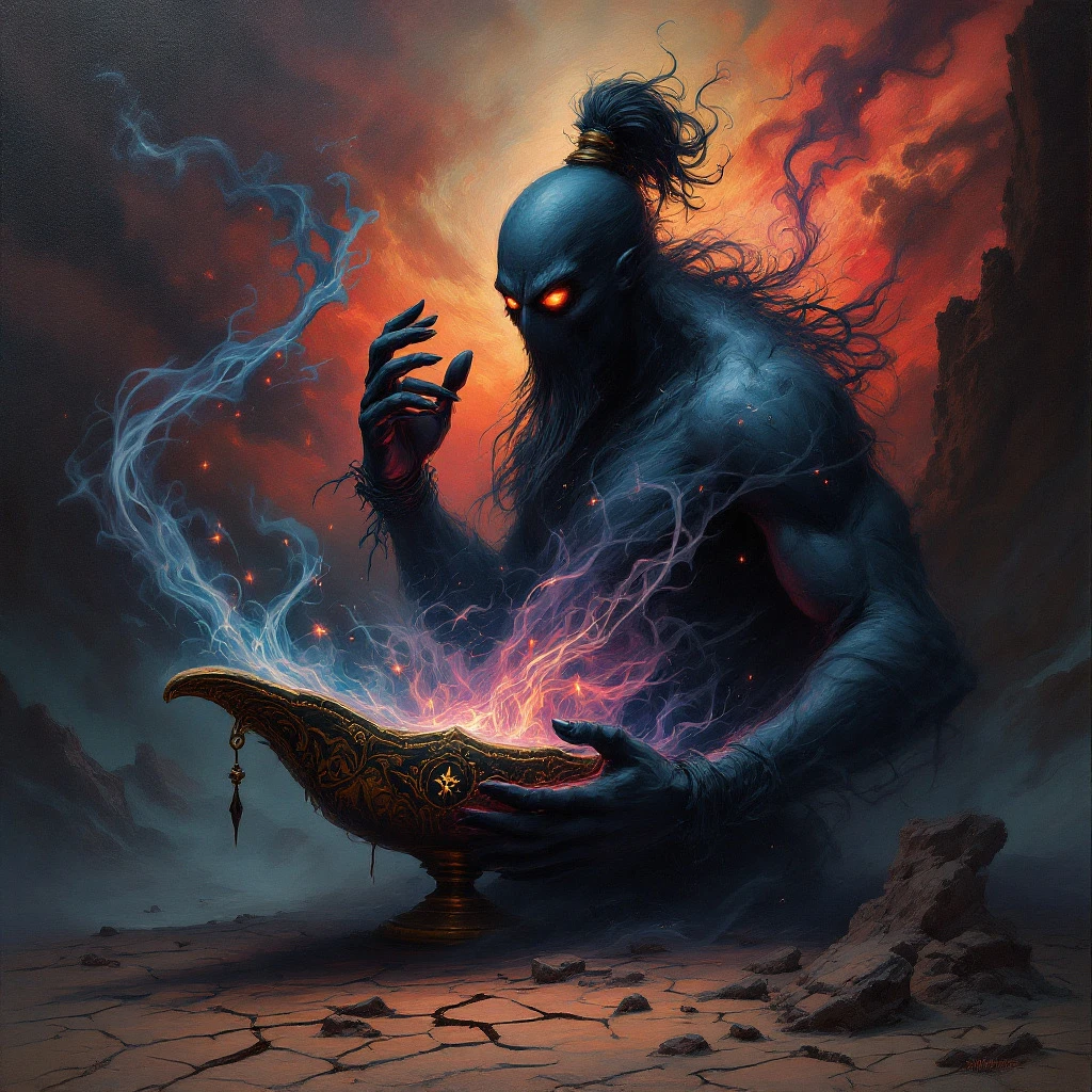 An award-winning oil painting of a dark genie, emerging from an ancient, ornate lamp, its form swirling with smoky tendrils of shadow and ethereal darkness. The genie’s eyes glow with an eerie, otherworldly light, and its expression is one of quiet malevolence and ancient wisdom. Its body is partially visible, a flowing, mist-like smoke, but the outline is jagged, as if part of it is still bound to the lamp, unwilling to fully reveal itself. The background is a tumultuous desert night, with distant storms raging under a blood-red sky, the ground cracked and dry. The genie’s presence distorts the air, creating a sense of unsettling power. Faint, arcane symbols pulse with a dim light along the genie’s form, hinting at dark magic woven into its being. The color palette is dominated by deep blues, smoky blacks, glowing crimson, and dark purples, with highlights of eerie light outlining the genie’s figure. The painting exudes tension, as if the genie’s next wish could either bring great power or destruction. This painting captures the essence of unseen forces, dark desires, and the perilous nature of wishes granted.