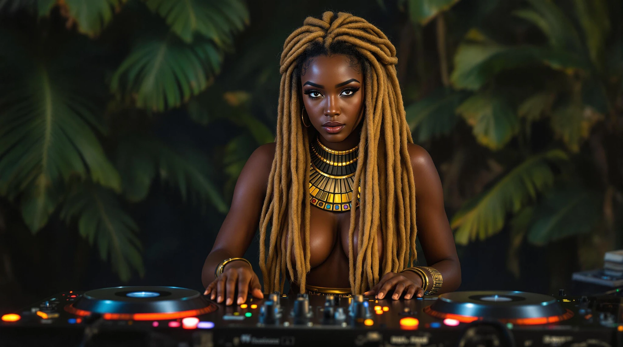 A photo of a 25 year old a egypt goddess with dirty blond dreadlocks, pharaoh clothes, natural, full body, necklace, hyper realistic, background Jamaican tropical, she is a DJ playing music on turntables, 8k, skin imperfections, skin texture, UHD, ULTRA DETAILS .