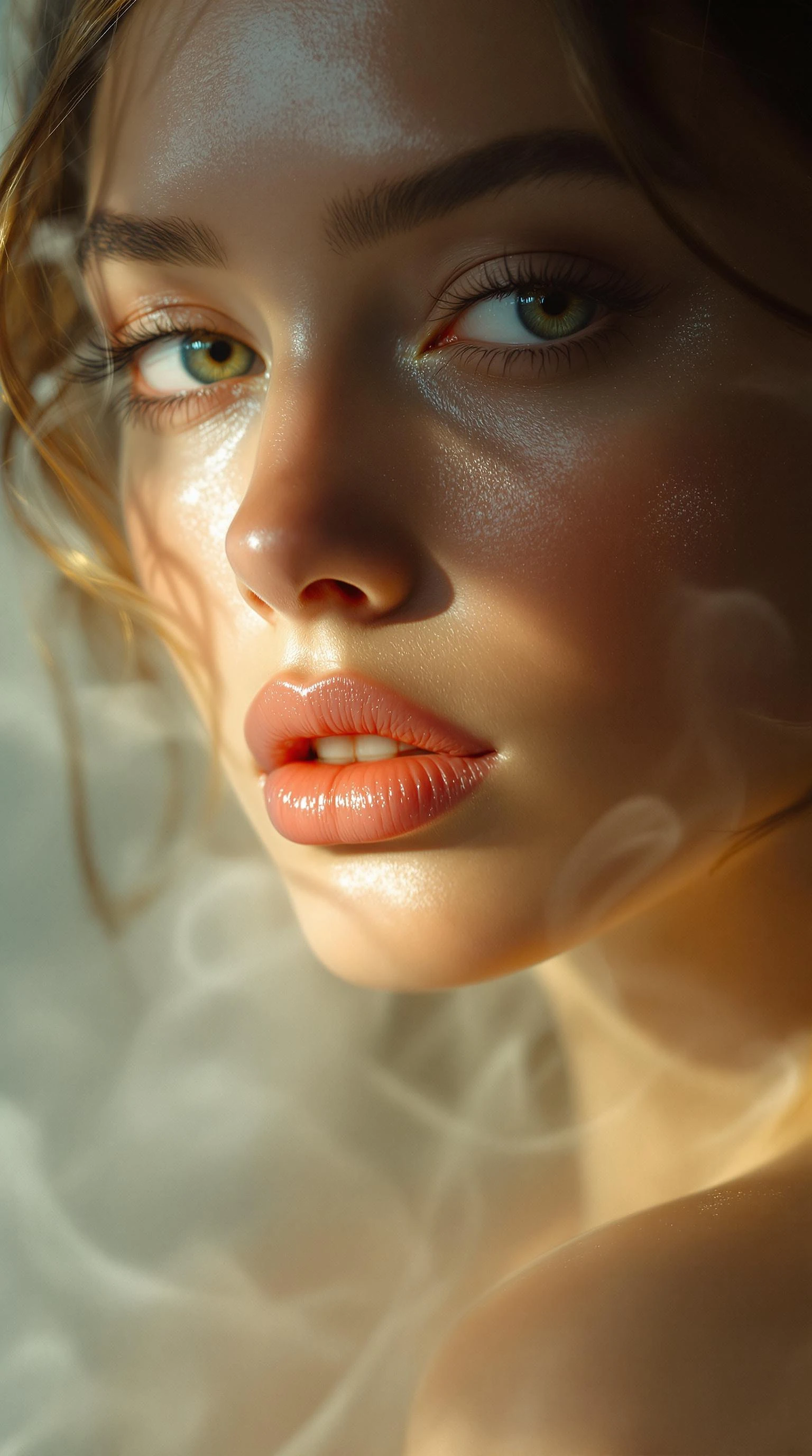 "Shadow & Light professional fine art photography. A model's portrait. Soft pastel colours, gentle lighting. Half her face is in shadow, the other bathed in soft pearl white and warm yellow, amidst swirling mist. Her piercing gaze and subtle sheen of perspiration are highlighted. "