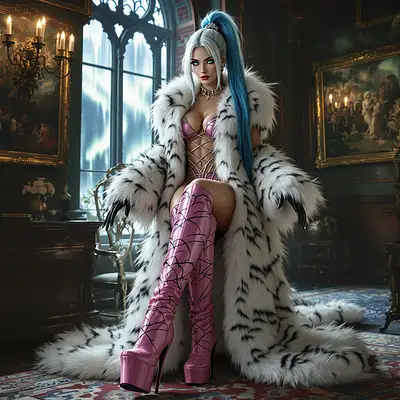 Evergarden, uper body open furry costume with feet, girl with ponytail, tiger eyes, extra long blue hair, Ariana, She wears (((Pink) )) knee-high high heel platform boots. Stiletto heel. White-black tiger print color to show. full body open dresses. She also has bright green eyes. The setting is a rundown trailer park, She has platinum hair.