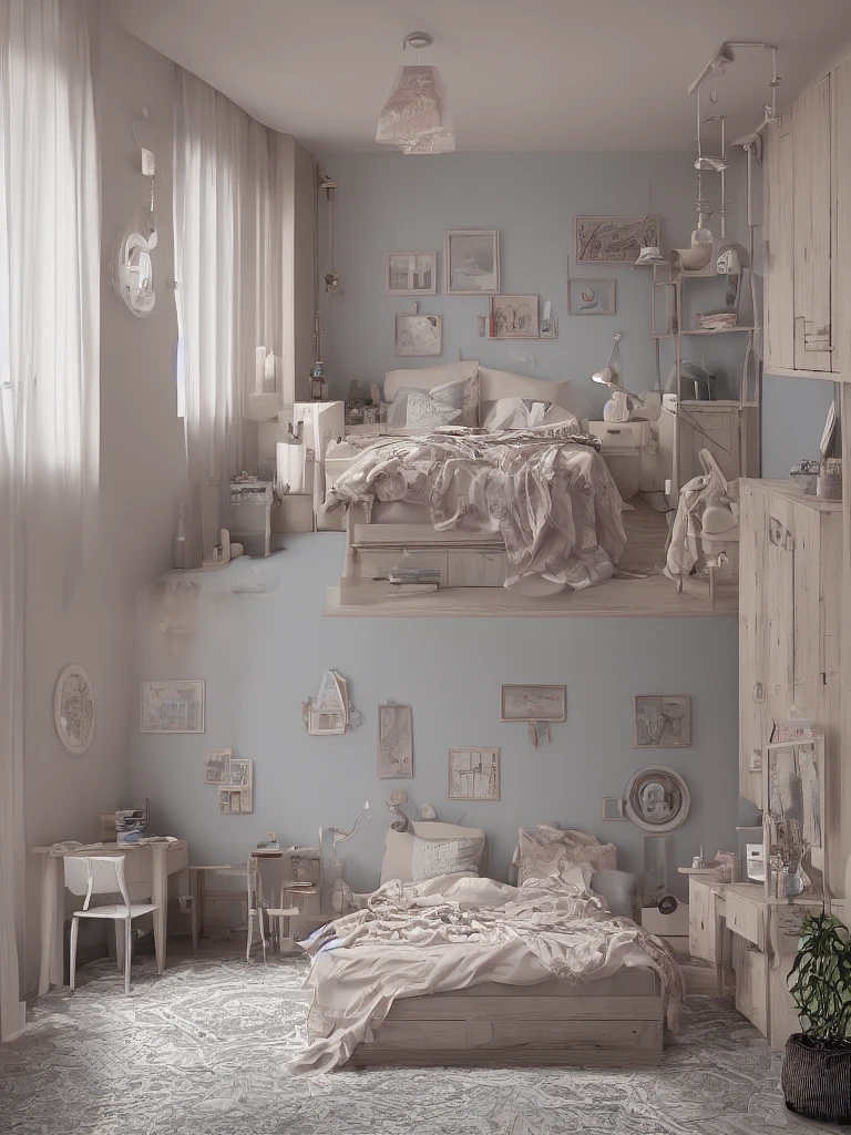 High resolution photography interior design, teenage's bedroom, beautifull floor, small windows opening onto the moonlight, modern and aesthetic furniture and decoration, high ceiling, beige blue salmon pastel palette, interior design magazine, smoke and cozy atmosphere; 8k, intricate detail, photorealistic, realistic light, wide angle, kinkfolk photography, A+D architecture