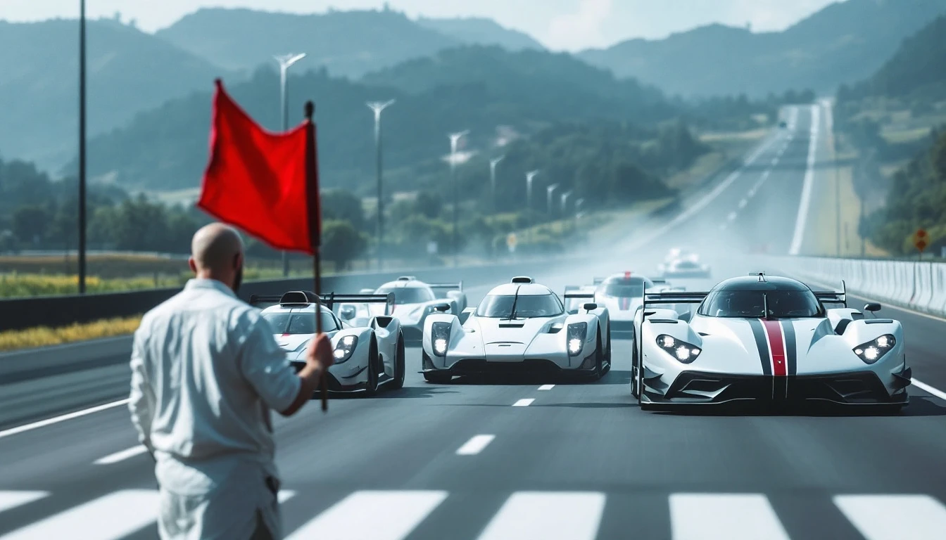 There are 5 racing cars at the starting line. On the side of the highway, behind the cars, there is a man in a white sports shirt, without a headdress, with a whistle and a red flag. The man whistles and gives the go-ahead signal with his flag. The camera from afar looks from the side, front and slightly above at 5 racing cars - bolides Standing on the track at the start line and at a person with a flag Style - cyberpunk