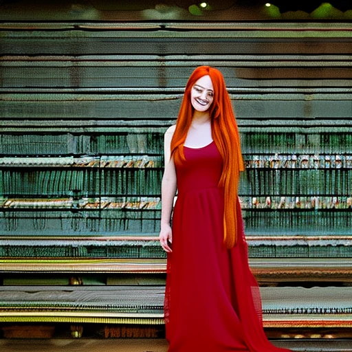 a beautiful girl with long red hair, green eyes, and a smile, wearing a long red dress, 8k