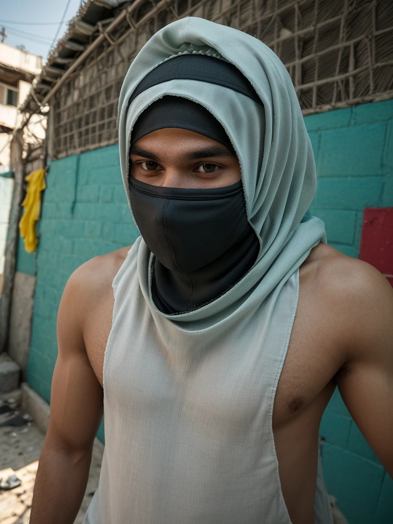 portrait of young male muslim dressing balaclava in Rio de Janeiro favela, ultra realistic, 8k full HD, low angle, unreal engine 5, cinematic, masterpiece, insane detail, real photography, bright colors, sun-soaked colours, Fujifilm X-T4, Sony FE 85mm --ar 900:1600 --s 750 --style raw --v 5. 2