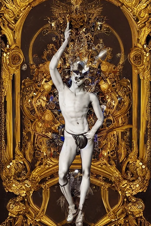 full-body bladerunner style sculpture of a young handsome Portuguese prince as a half cibernetic android with a chest opening exposing circuitry and electric sparks, glowing laser beam eyes, crown of giant diamonds, flowing neon-colored silk, fabric, raptors. baroque elements. full-length view. baroque element. intricate artwork by caravaggio. many many birds birds on background. Trending on artstation, octane render, cinematic lighting from the right, hyper realism, octane render, 8k, depth of field, 3D