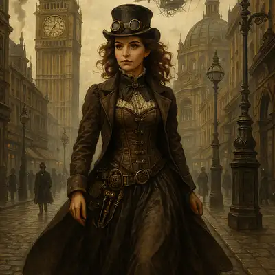 Steam-punk Victorian inspired manga, a woman with porcelain skin, curly brown hair, and intricate brass goggles, and a man with a strong jawline, leather-bound boots, and a top hat, inside a luxurious, brass-adorned upscale train carriage, looking out the window at a dystopian England landscape with smog-filled skies, industrial machinery, and abandoned buildings, the woman's eyes fixed on the scenery with a mix of curiosity and concern, the man's eyes narrowed in thought, both dressed in elaborate, steam-punk inspired attire with copper accents, gears, and other industrial elements, the train carriage's interior adorned with plush velvet seats, polished wooden panels, and large windows offering a panoramic view of the desolate, industrial landscape outside.