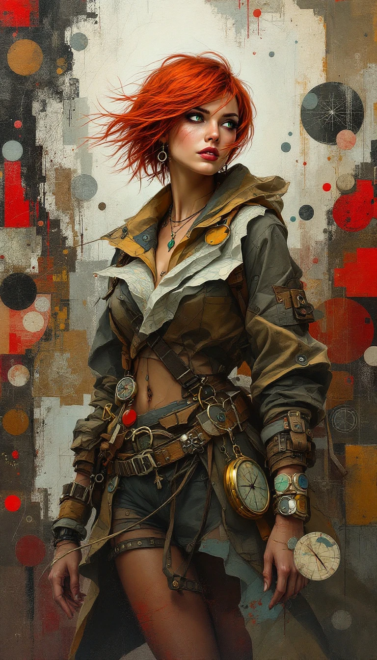 "Ruby Cartographer in a Shifting Realm": A dynamic abstract painting presents a cartographer, showcasing both skill and an adventurous spirit. She is a fearless explorer, depicted within a world where the landscape seems to twist and change, with a tanned complexion, short, vibrant ruby-red hair styled in a practical, windswept cut, and a layered outfit designed to withstand the elements. Maps, compasses, and navigational tools are woven into her clothing and are held in her hands. The artwork masterfully combines contemporary art with a figure study, creating a dynamic and intriguing scene with colors such as reds, browns, and grays. Her sharp, green eyes, the composition’s focal point, convey a keen intellect and a passion for discovery. After a long journey through uncharted lands, the cartographer embodies both resilience and a love for the unknown. The layered designs and shifting perspectives invite the viewer to explore the hidden stories within this vibrant painting.