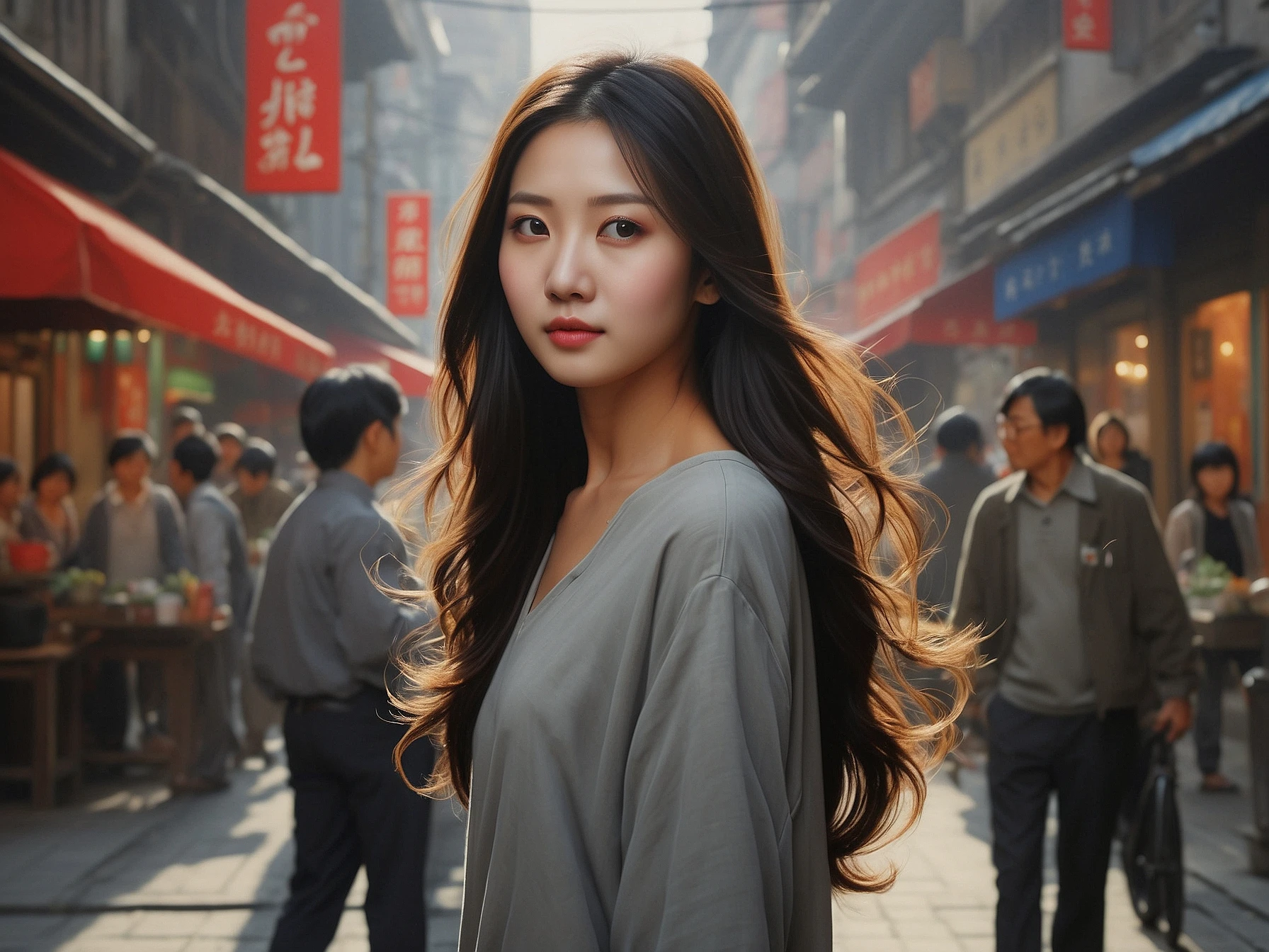 a woman with long hair standing on a street, a photorealistic painting by Song Maojin, cg society contest winner, photorealism, photorealistic, ultra realistic, rendered in unreal engine
