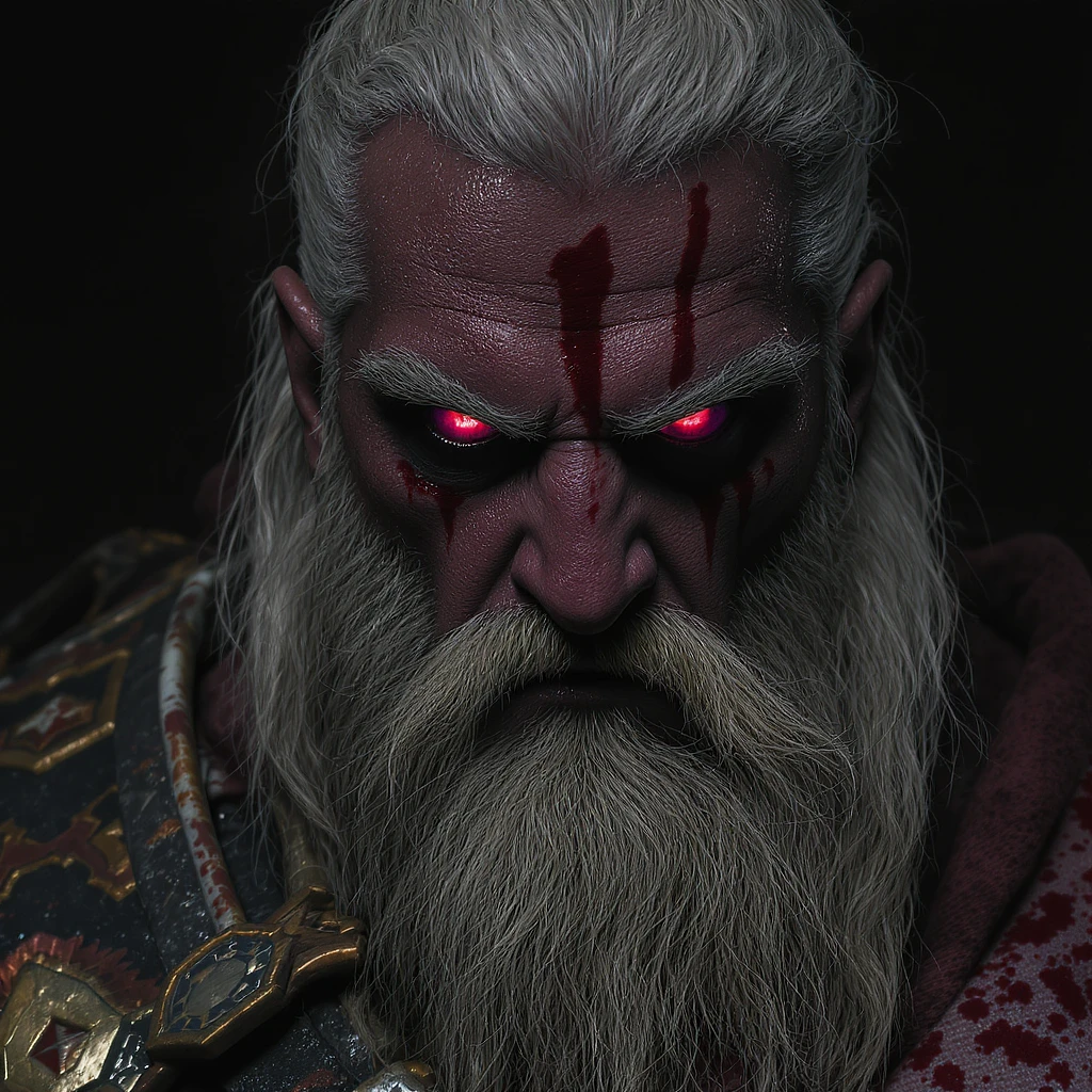 The man Warrior gotic sombrio and powerful, evil look, thoughtful look, atmosphere of darkness and horror, long hair white anda gray. . . your eyes ambar . . . dramatic light, highly detailed, packed with hidden details, hyper realistic, colorful realism, realistic attention to detail, highly detailed, uhd image, realism, colorful realism, UHD, 8K