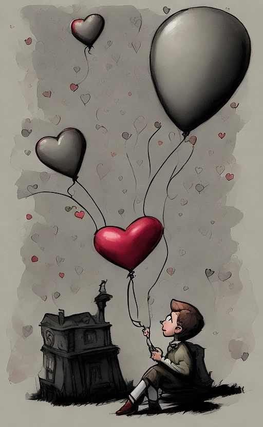 a poster depicts a boy holding a heart shaped balloon, in the style of sketchfab, poodlepunk, warm tones, #screenshotsaturday, romanticized figures, expressive comic panels, romantic academia --ar 71:128 --stylize 750 --v 6