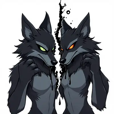 Two Black Wolf almost toony full body fursonas with dark gray, closer to black, highlights. It also has eyes which contain an ombre of mostly green, some orange, and a little bit of red. It has a plain metal chest making a v-neck shape without any screws or rivets. The two fursonas are splitting apart with an ink like substance between them as if they're trying to pull apart. They have their paws up dripping ink