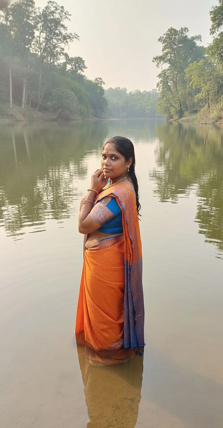 The uploaded woman stands in a serene lake, her back to the viewer, looking over her shoulder with light blue eyes that shimmer with allure. She is very wet from having just risen out of the water. Her hand gently touches her face, conveying a mix of vulnerability and confidence. The clear sky reflects the calm water, creating a tranquil, almost ethereal atmosphere. The scene is bathed in soft, diffused sunlight, casting a gentle glow on her skin. The background is a lush, natural landscape with tall trees framing the lake, enhancing the sense of isolation and intimacy.