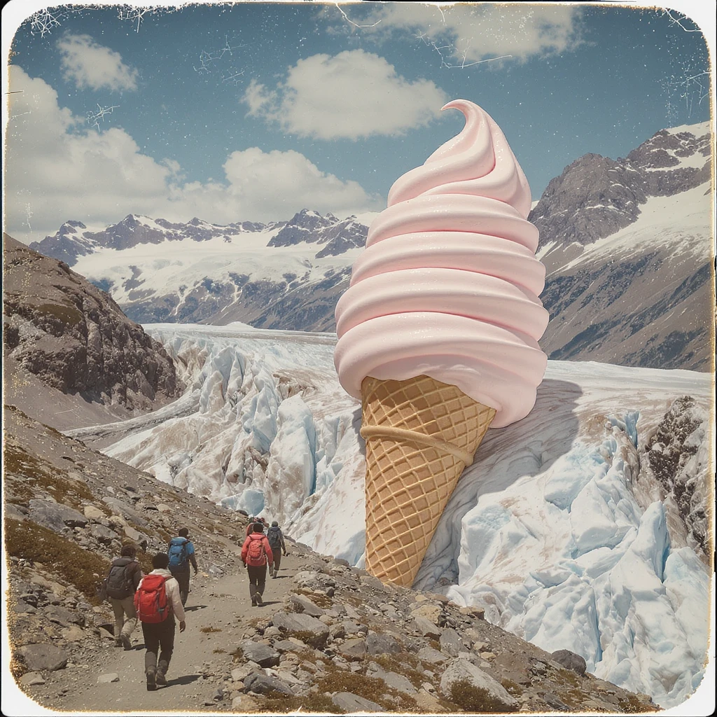 A surreal vintage-style photograph. A group of African American hikers walk along a rocky path beside a glacier, but the glacier is creatively depicted as a giant swirl of soft-serve strawberry ice cream. A massive ice cream cone is placed upside down into the mountain, appearing as if it’s dispensing the glacier. The sky is bright blue with soft clouds.