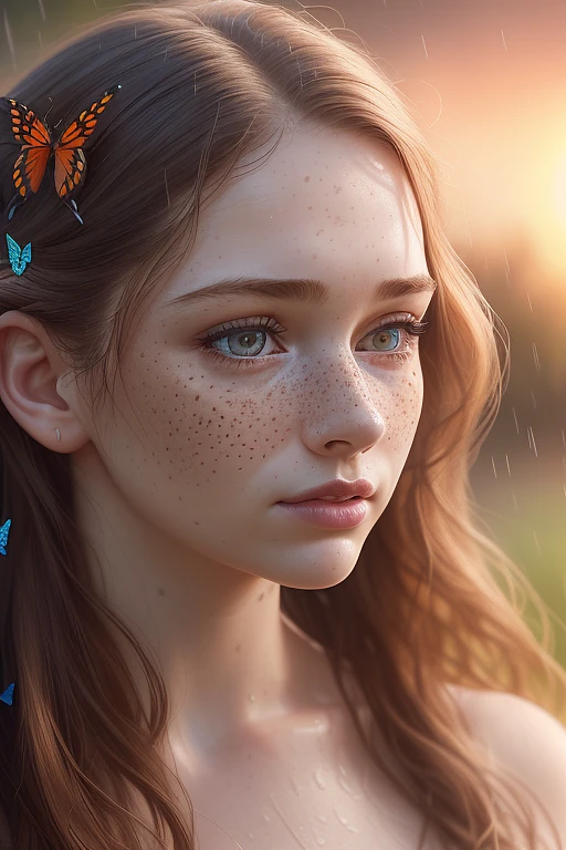 (head and shoulders portrait shot:1. 2) photo of a gorgeous young woman, A highly detailed and hyper realistic, butterflies, floral, sharp focus, studio photo, intricate details, highly detailed, few freckles, sunset lighting, rain, 8k, intricate detail, photorealistic, realistic light, wide angle, kinkfolk photography