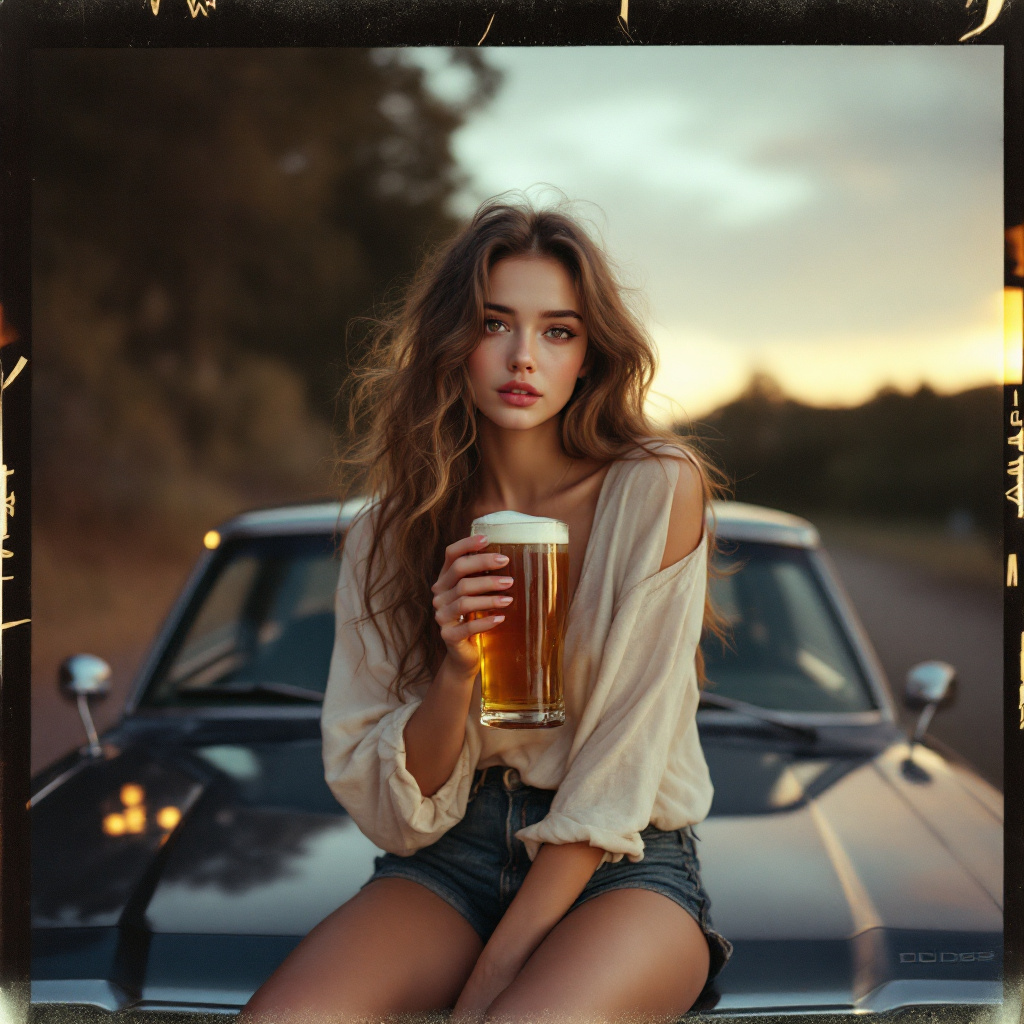 "A hyper-realistic, film-grained Polaroid photo of three irresistibly cute young Aphrodite standing siting on a hood of a Dodge. She is drinking warm beer. She has delicate, ethereal beauty with glowing skin, expressive eyes, and flowing hair, dressed in warm, elegant yet casual outfits. The ambiance is filled with warm earth tones, and softly blurred lights in the background. Captured in a long exposure shot, creating a dreamy, cinematic feel with a natural sense of motion. The atmosphere is intimate, nostalgic, and inviting.