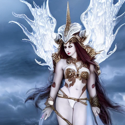 a white two headed dragon wearing a helmet and jewelry, and fluffy fox-like tail full body, Demon Horns, Angel Wings, Fantasy art, 8K, Highly Detailed, Dramatic Lighting, high quality, ray of god, explosion, lens flare, overexposure, quality, colorful, hdr, concept design, photorealistic, hyper real, Alphonse Mucha, Pixar, the best quality, super fine illustrations, extremely detailed eyes and face, beatiful detailed steet, sharp focus, beautiful detailed, face very realistic, very delicate light, fine lighting, very fine 8KCG wallpapers, luminous particles , Unreal Engine5, 8K