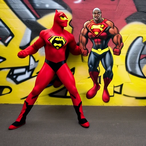 a blackman in a red and yellow superhero suit fighting a white man in a dog superhero suit, in front of a graffiti wall