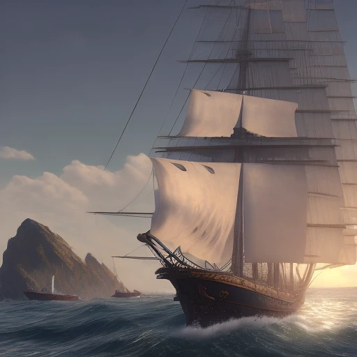 Photo of a ultra realistic sailing ship, dramatic light, pale sunrise, cinematic lighting, battered, low angle, trending on artstation, 4k, hyper realistic, focused, extreme details, unreal engine 5, cinematic, masterpiece, art by studio ghibli, intricate artwork by john william turner