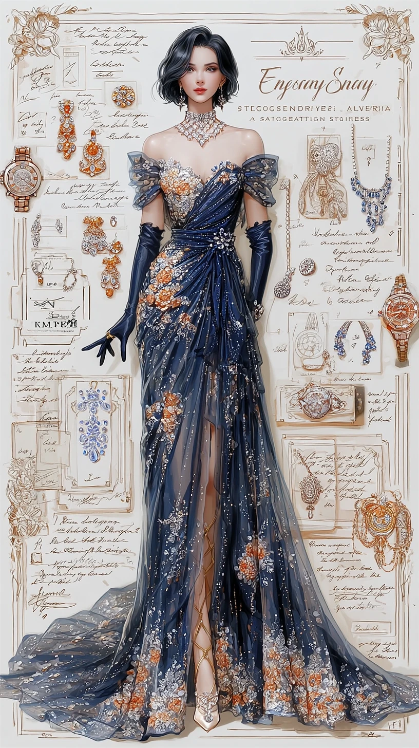A sophisticated fashion illustration of a graceful, elegant woman in a luxurious black evening ball gown, embellished with shimmering sequins, delicate floral embroidery, and layered flowing tulle. The design features a strapless sweetheart neckline, a cinched waist, long black opera gloves, and a dramatic train. Her short black hair is styled in a refined updo, adorned with sparkling jewelry including chandelier earrings and a diamond necklace. The background is a detailed fashion concept board with design sketches, technical garment notes, fabric swatches, accessories like gloves, earrings, and necklaces, and various styling annotations. Artistic handwritten scripts and diagrams add a vintage couture touch. High-resolution, soft lighting, fashion design sheet layout, elegant grayscale theme with hints of silver and gold. --ar 9:16 --v 7 --exp 100 --style raw