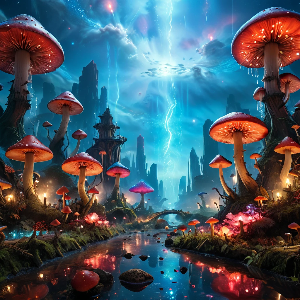 surreal atmosphere, city, future, sci-fi, epic fantasy photo, city illuminated by a red and blue light, with a lot of mushrooms, a stream of water, a city made of crystals, beautiful picture, the sky is full of stars and nebulae and planet, lensflare, dynamic light, 8k, uhd, ultra realistic photo, realistic photography, cinematic view, cinematic angle, best quality, masterpiece:20