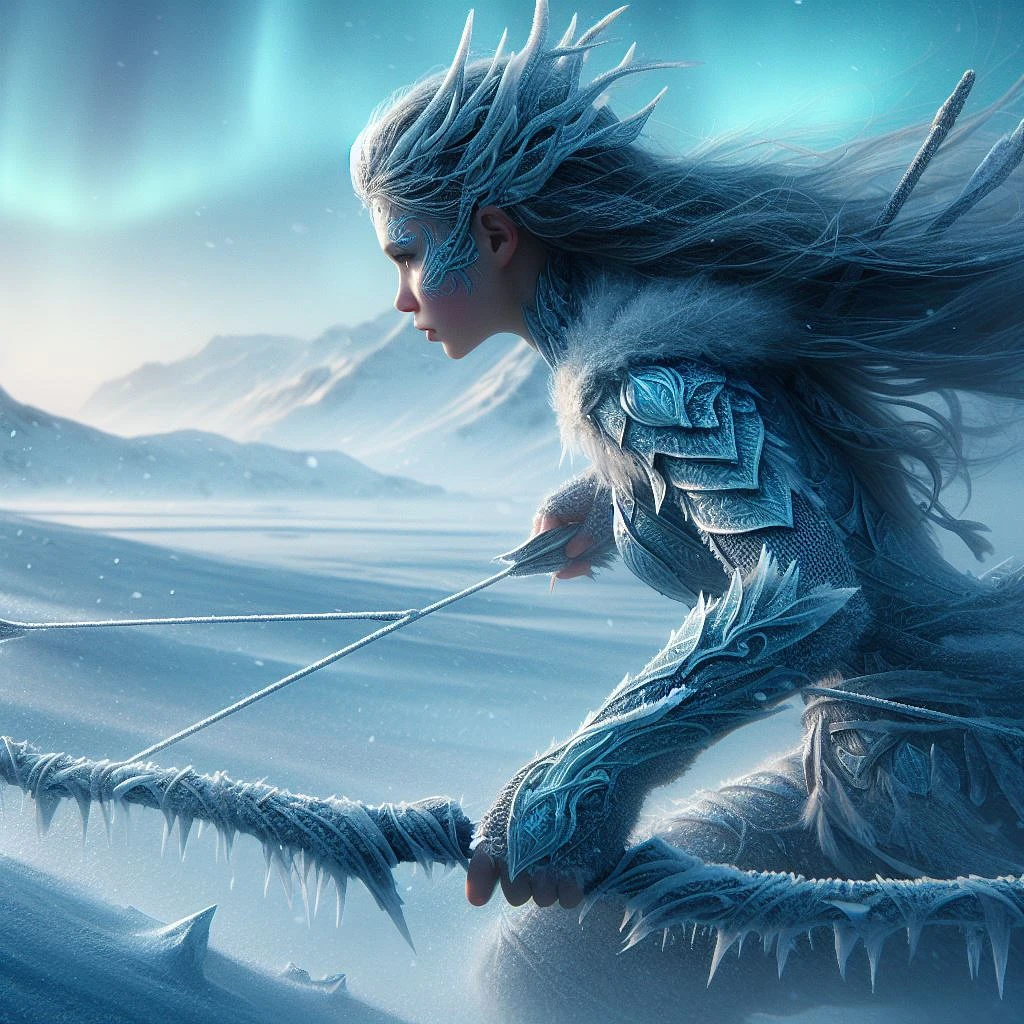 On the edge of a vast, frozen tundra, Sif, a fierce and agile frostbite ranger, tracks her prey across the snow-covered wastes. The soft, diffused light of the aurora borealis illuminates her intricate, ice-crystal armor, revealing the delicate, frost-etched patterns that adorn her powerful, enchanted bow and the subtle, glowing runes that mark her as a guardian of the frigid wilds.