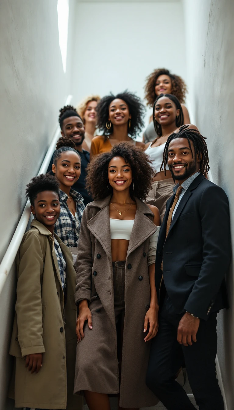 Photo of a 6 white people and 2 blacks ultra realistic friends, in a tight white modern stairway, men and women, in their 30s and 40s, some facing the camera, smiling, fashionable, in the style of hyper-realistic National Geographic photography, expressive, hyperrealism, photorealistic, detailed hair, hyper detail, cinematic lighting --ar 1:2 --stylize 750