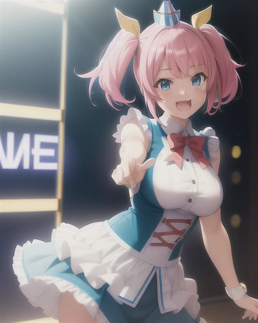 girl, happy, twin tails, beautiful short hair, spectacular, realistic, birthday party, party hats, banner, indoors, cute. anime, professionally color graded, HDR, anime faces, hyper resolution, created by Artgerm, Greg Rutowski volumetric lighting, intricately detailed outfit, dynamic pose, octane engine, unreal engine