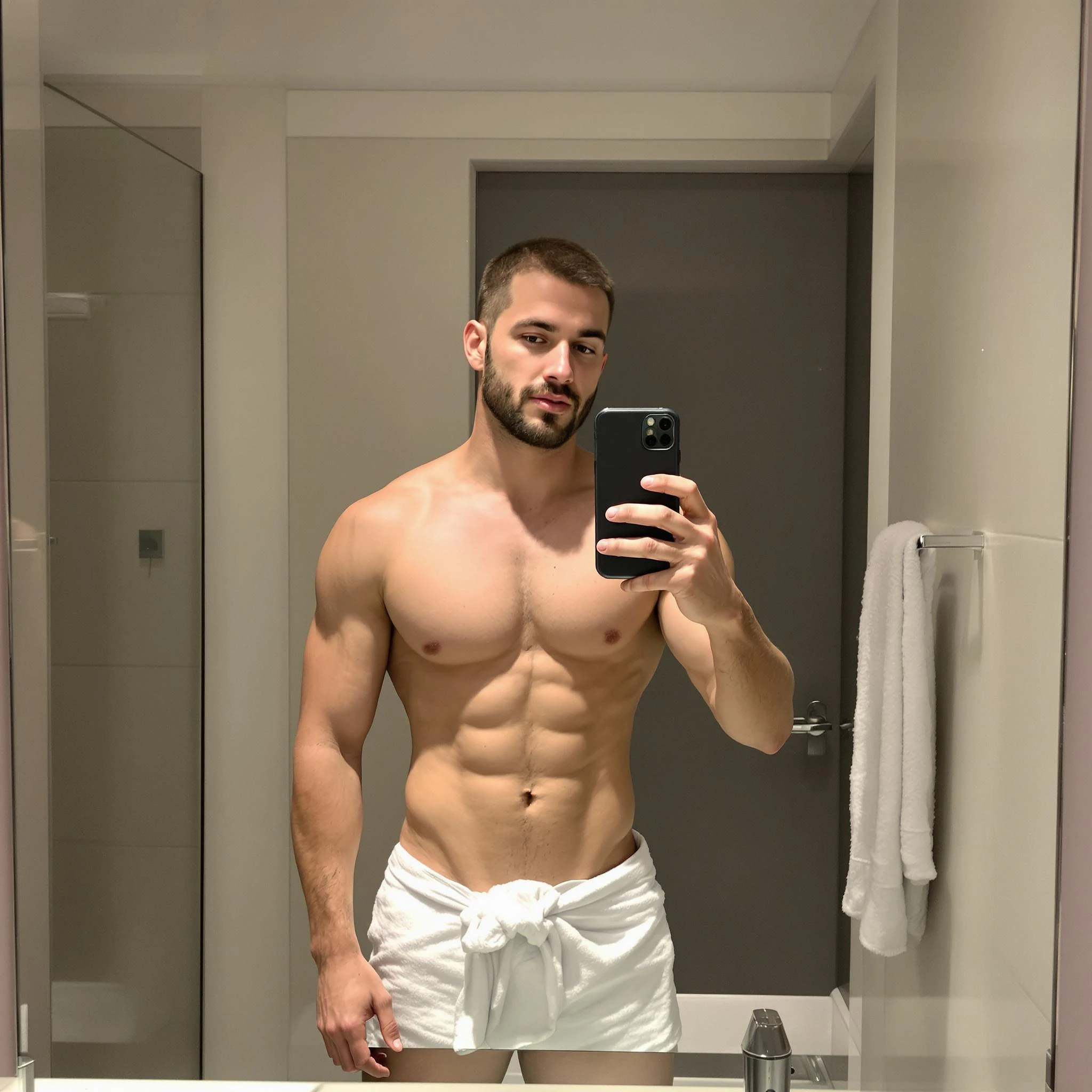 A European man, 29 years old, with short brown hair, standing in front of a mirror taking a selfie with iphone 14, He is wearing only a white towel wrapped around his waist, showcasing his athletic physique with well-defined six-pack abs. The bathroom is modern, with a clean and minimalistic design, featuring a large rectangular mirror, bright lighting, and subtle reflections. The man's expression is confident yet relaxed, capturing a moment of self-assurance. The overall atmosphere is fresh and vibrant