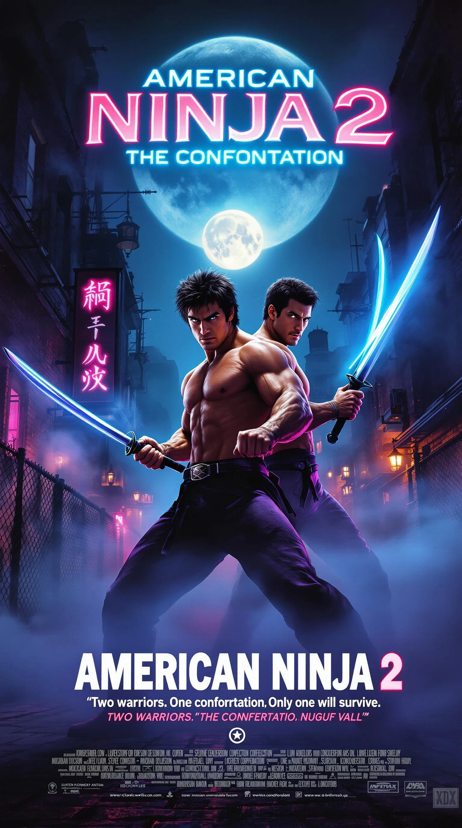A hyperrealistic, 80s-style cinematic poster design for American Ninja 2: The Confrontation. The poster features Steve James as Curtis Jackson and Michael Dudikoff as Joe Armstrong in dynamic, action-packed poses, highlighting the iconic martial arts combat vibe of the film. Michael Dudikoff stands in the foreground, posed in a classic martial arts battle stance with a katana gleaming in his hand. His athletic build, signature 80s hairstyle, and intense expression capture his role as the skilled and fearless hero. Beside him, Steve James as Curtis Jackson adopts a powerful fighting pose, brandishing dual curved swords with precision and grace, emphasizing his martial arts mastery and iconic 80s action-hero energy. The title "American Ninja 2: The Confrontation" is emblazoned across the top in bold, neon-lit 80s-style typography, glowing with an electric blue and red gradient that captures the retro vibe of action movie posters from the period. The text has sharp edges and bold lettering, evoking a mix of danger, suspense, and adrenaline. The background is a gritty urban landscape infused with fog and neon lights, combining both martial arts tension and retro-futuristic action aesthetics. A full moon rises ominously behind the fighters, casting dramatic light over their silhouettes. Smoke and mist swirl through alleyways and across worn cobblestone streets, reflecting the glow of neon signs and streetlights, adding depth to the confrontation theme. Key elements like a chain-link fence, brick walls, and shadowy figures lurking in the mist suggest imminent danger and an epic fight between good and evil. Michael Dudikoff's figure is highlighted in dramatic volumetric lighting, with sharp beams of blue and purple cutting through the mist, emphasizing his tense muscles, battle-worn clothing, and heroic stance. Steve James, standing beside him, is similarly illuminated, with the shine of his swords catching the neon glow, adding to the poster's intense, electrifying atmosphere. Both characters are rendered with hyperrealistic detail, showing sweat glistening on their skin, the texture of their clothing, and the raw emotion of combat readiness. The tagline, written in bold white retro typeface at the bottom of the poster, reads: "Two warriors. One confrontation. Only one will survive. " This line captures the essence of the film's plot—intense martial arts battles, heroism, and suspense—while maintaining the classic action movie tone of the 1980s. The bottom of the poster also features movie credits, stylized in that classic blocky, bold 80s font, adding authenticity to the retro poster vibe. The entire scene is designed in stunning hyperrealistic quality, focusing on period-accurate 80s aesthetics, iconic martial arts poses, dynamic lighting, atmospheric effects like neon glow and mist, and the unmistakable tension of a climactic action movie moment. This poster perfectly captures the spirit of 80s action cinema nostalgia, paying homage to American Ninja 2 and its legendary heroes.