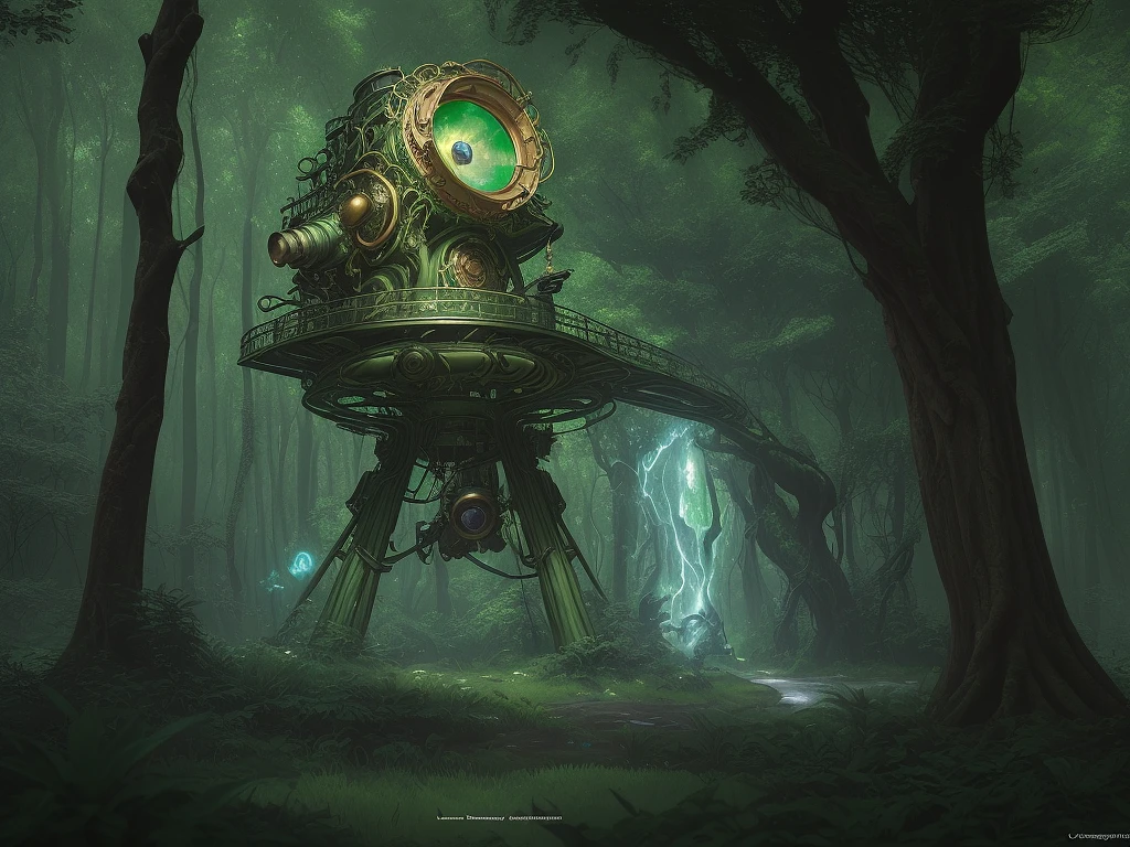 green lush forest with a magical portal at its core, photorealistic, cinematic lighting, drawn by jhon constable, Breath of The Wild, Art Nouveau steampunk Epic astronomical telescope, miyazaki, Craig Mullins, nausicaa, high detail, 8K, CGsociety, hypermaximalist, octane render --ar 16:9