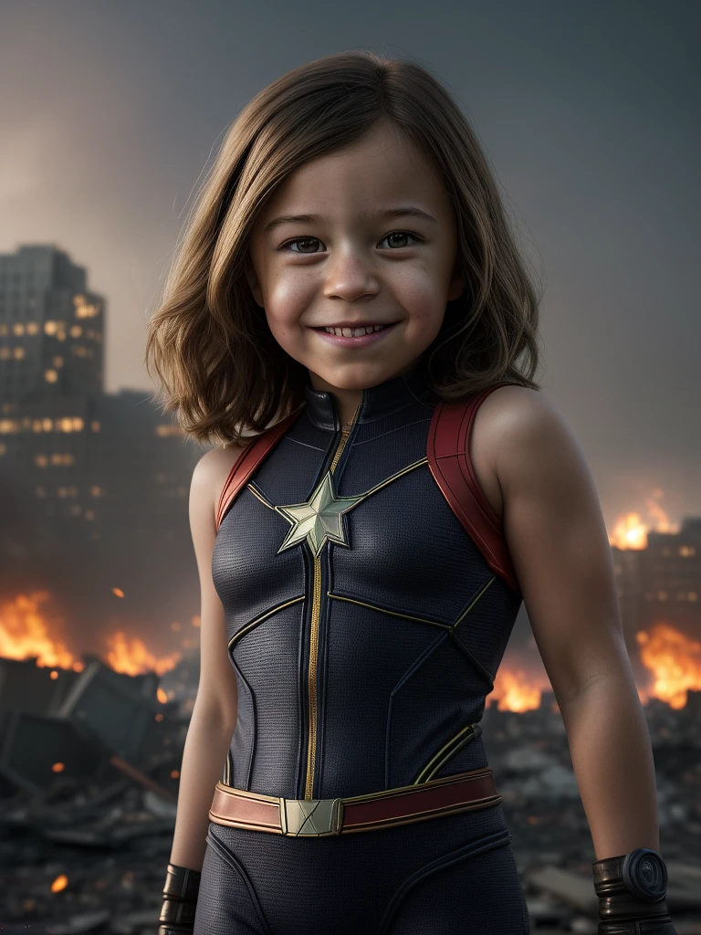 Realism, best realism, portrait, portraiture, portrait photography, little Ms. Marvel, marvel movies, marvel comics, marvel universe, smile, background of destroyed city on fire, future, scary town, sharp focus, gradation, focus the light on the face, natural light, light from the front, detail, high quality, hd, 4k, 8k, sony camera style, photography, lens f1. 2, epic, pixar, trailer movies,