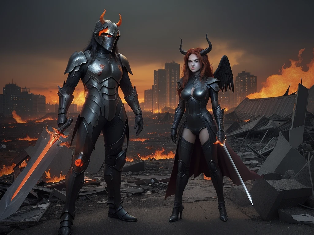 a dramatic scene of a male demon and a female angel standing amidst a fiery, ruined cityscape, captured in a wide-angle perspective that emphasizes their contrasting figures. The male demon wearing a Dark, armored suit with a helmet featuring large, curved horns, glowing orange eye and Long, dark locks. Standing with a sword in hand, gazing down at the female angel. The Female Angel wearing a White, sleeveless top and black skirt slit up the right thigh, Long, flowing white locks, a Gold halo, gold necklace, gold armbands and an ample bosom. Subtle makeup enhancing her natural features. She is standing with her head tilted back, gazing up at the male demon the background is a ruined cityscape with burning buildings and debris scattered everywhere. A dark, ominous sky with clouds of smoke and ash looms overhead. The overall atmosphere is one of destruction and chaos, with the two figures standing out in stark contrast to the desolate backdrop.