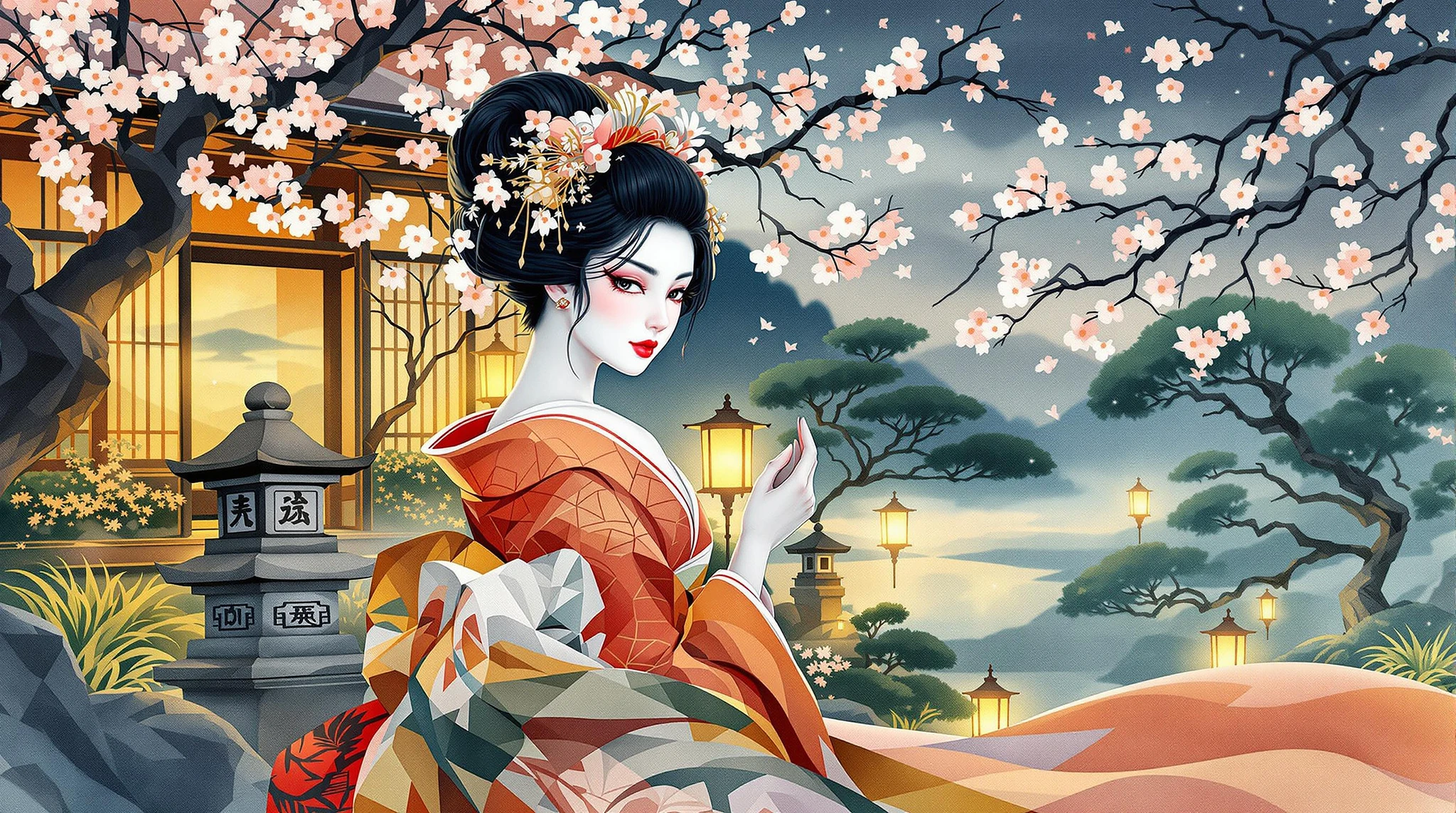 A vibrant watercolor portrait of a Japanese geisha, depicted in dynamic motion, set amidst a serene and mysterious Japanese garden at dusk, illuminated by soft, warm lantern light. The style is a blend of Paul Klee, Modigliani, and minimalist line art, with sketchy color accents. The geisha's pale skin and dark hair are prominent. Delicate cherry blossoms, bonsai trees, or gentle stone lanterns subtly peek from behind the geisha, blending with the soft, gradient earth tones of the background, ranging from warm terracotta to cool moss and sage, now infused with Japanese blue gradients and earth-toned greys in both cool and warm tones. The lanterns cast a soft, warm glow, enhancing the dreamy, enchanting atmosphere of the scene.