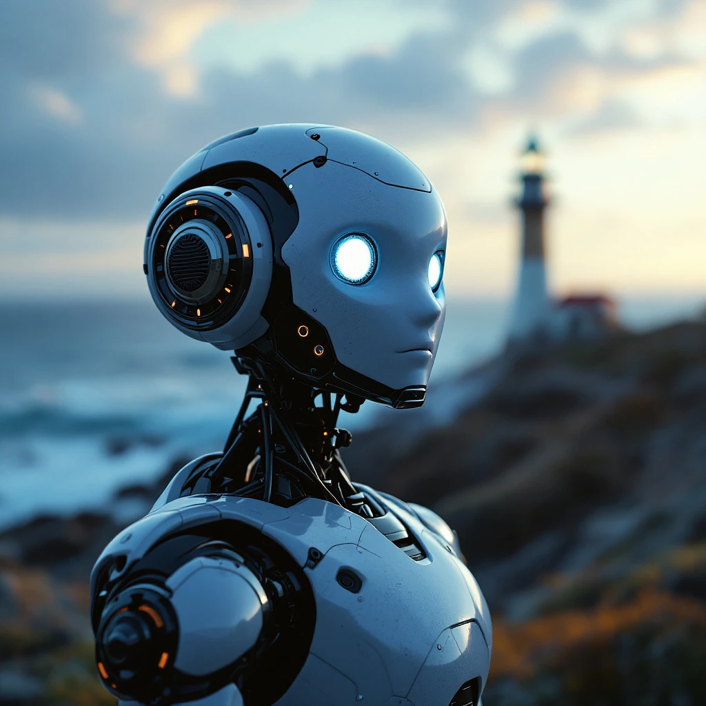 Upper body portrait of an adorable robot with a lone lighthouse on a windswept coast in the background, soft shading, solo, robot, volumetric lighting, masterpiece, best quality, good quality, dutch angle, close-up, rim light.