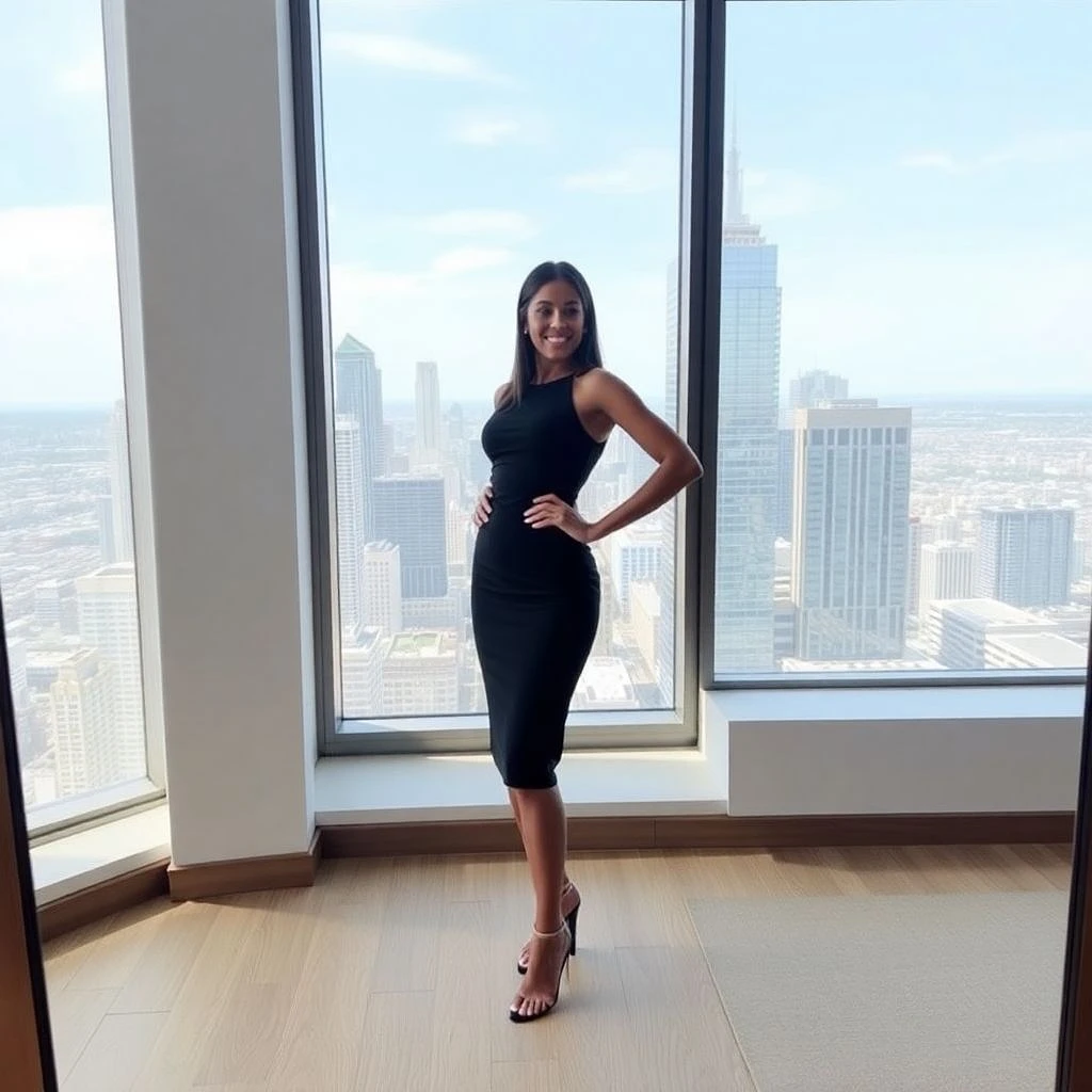 Selfie, sleek black dress, high heels, standing in front of a large window with a city view, hand on hip, a confident and seductive expression. Minimalist apartment setting.