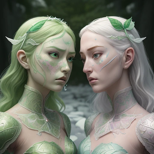 two human like ice cream fairys, intricate, realistic face, detailed portrait, detailed face, green outfit, insanely detailed, vivid color, trending on artstation, 4k, hyper realistic, focused, extreme details, cinematic, masterpiece, concept art by Katsuhiro Otomo and studio ghibli, amidst ice cream, alex ross, eddie mendoza, raphael lacoste, sebastian ludke, concept art, matte painting, highly detailed, rule of thirds, dynamic lighting, cinematic, detailed, magnificiant landscape, denoised, centerd