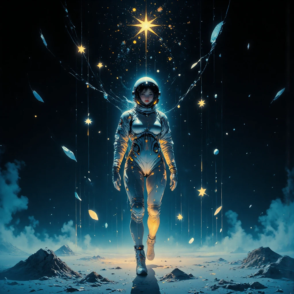 (A hyper-realistic, masterpiece-level photograph:1.3) of a woman floating in the cold, dark expanse of space (space environment:1.4) . She is wearing a futuristic, sleek spacesuit (spacesuit:1.5) , with the suit reflecting soft starlight and the surrounding cosmic glow. Her body is suspended in a weightless pose, as if she is drifting through the void, her legs slightly crossed, and her arms gently extended. The scene is both haunting and serene, with the surrounding atmosphere filled with a cold, ghostly aura (cold and haunting space:1.4) . Above and around her are small, glowing stars (glowing stars:1.5) , each tethered to floating debris or satellites by thin, delicate chains. These stars are scattered at various depths and distances throughout space, some glowing softly near her, while others float further away, deep into the cosmic void. Their warm yellow light contrasts sharply with the coldness of space, creating dynamic reflections on the woman's spacesuit and the surrounding cosmic dust. The stars and cosmic dust form intricate volumetric beams of light (volumetric lighting in space:1.4) , casting reflections and shadows that stretch endlessly into the darkness. The light scatters across the floating debris, interacting with her spacesuit's helmet visor, creating shimmering, surreal patterns. Surrounding her in the distance are floating particles of cosmic debris and dust, glowing with a soft, bioluminescent-like aura (cosmic dust particles:1.4) . These particles drift at different distances, enhancing the sense of depth in the vastness of space. Some particles float close to her, while others drift far into the background, adding texture and realism to the scene. The stars' glowing light creates a cinematic, volumetric effect that bounces off the metallic and glass surfaces of her suit, emphasizing the sleek, futuristic design. Air-like particles and space dust (realistic space particles:1.3) drift lazily around her, while her hair floats inside the helmet, mimicking the motionlessness of zero gravity. The overall mood is cold, haunting, and beautifully eerie (cold and haunting space:1.4) , with the tethered stars, floating space debris, and glowing cosmic particles creating a surreal yet hyper-realistic otherworldly environment. The scene captures a moment of absolute stillness, making the viewer feel as though they are suspended in an infinite cosmic landscape