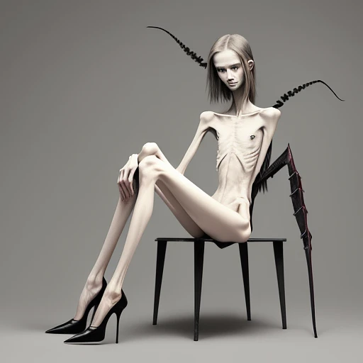 a needle-thin anorexic girl with skinny long legs and long skinny calves in high heels with long hooked claws, sitting naked