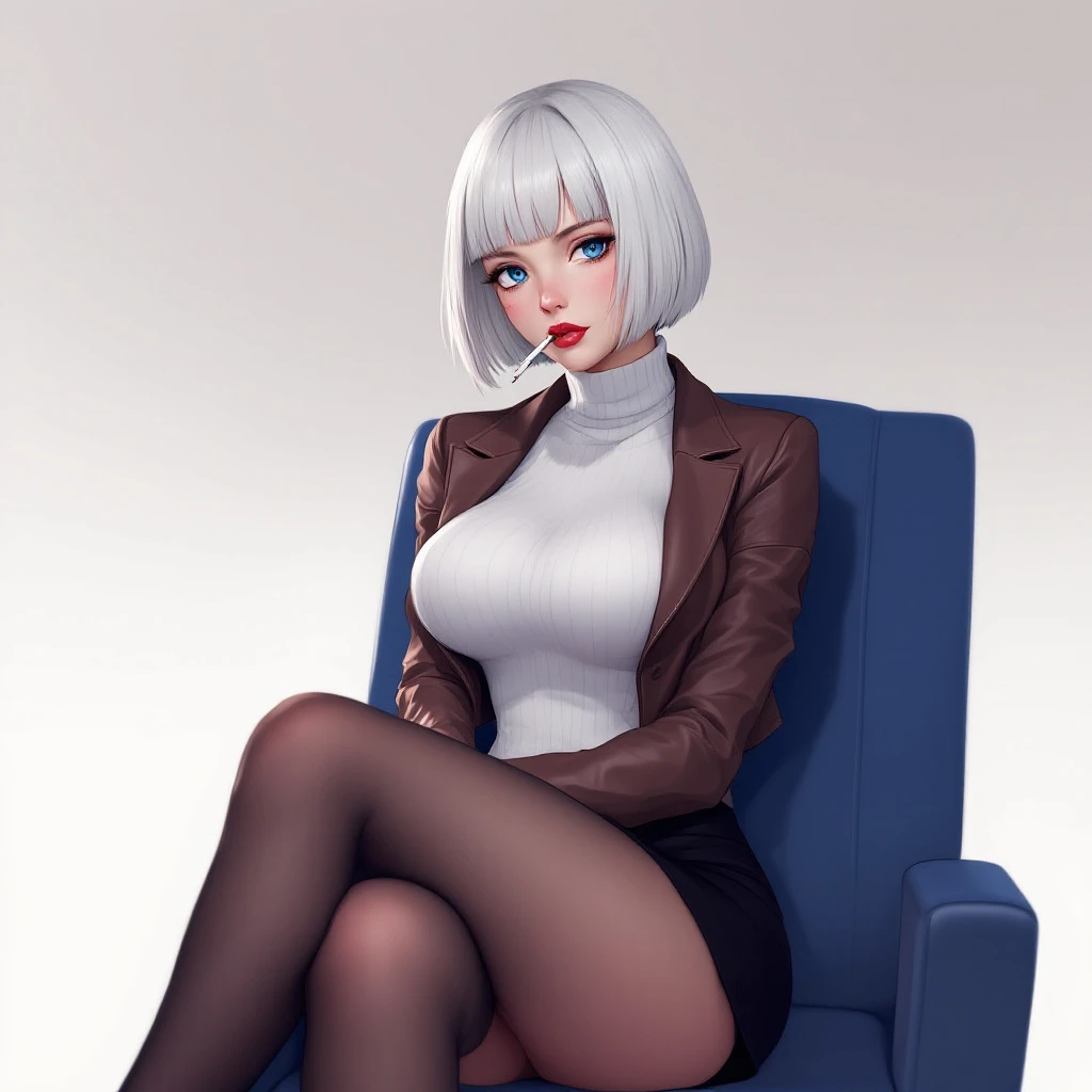 anime, woman, white hair, bob cut, blue eyes, freckles, red lips, white turtle neck sweater, tight turtle neck sweater, short leather jacket, brown leather short jacket, black tight skirt, short skirt, bare legs, black high heels, bored expression, sitting on a chair, sitting with legs crossed, big chest, smoking a cigarette, black stockings wit straps