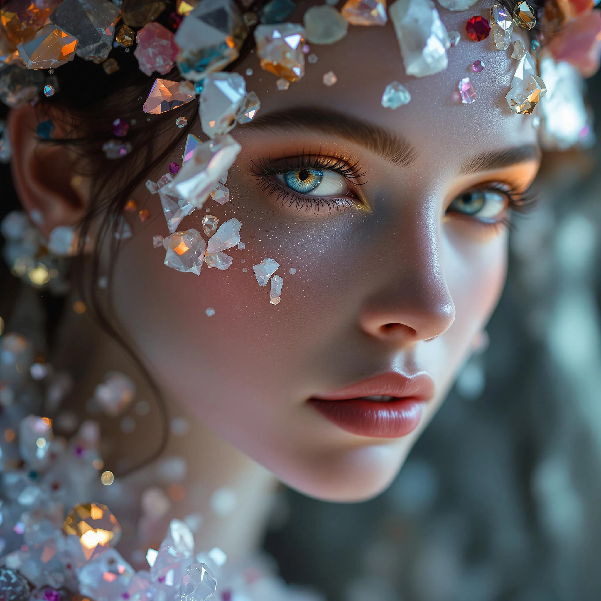 Hyperreal portrait of a mystic woman with crystal shards growing directly from her skin, her hair adorned with raw gemstones, her eyes reflecting future visions. Her skin is smooth and luminous, with light bending and fracturing across the crystals like a living prism. Camera Settings: Camera: Sony A7 III Lens: Sony 50mm f/1. 8 Aperture: f/1. 8 for shallow depth of field ISO: 100 Shutter Speed: 1/125s Lighting: Studio lighting with focus on the crystals to enhance their sparkle