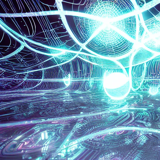 bioluminescent ethereal orbs shape cyberpunk, symmetrical patterns flowing around a surreal universe, High resolution photography, sharp focus, intricate detail, photorealistic, realistic light, wide angle, 3D render