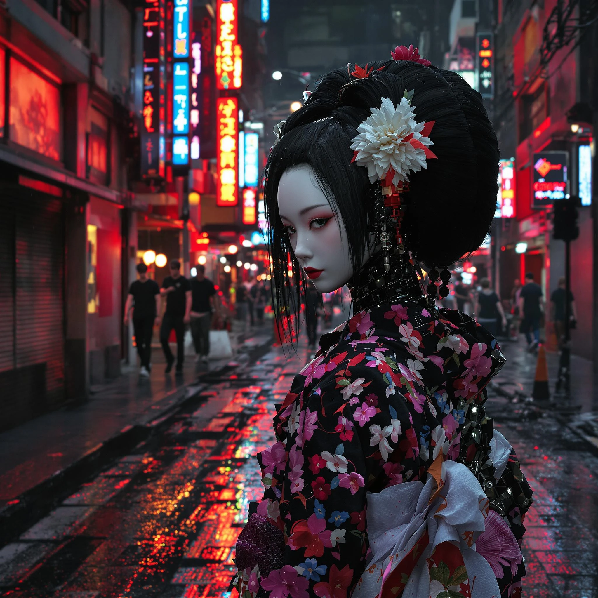 High resolutions. Hyperdetailed cyborg humanoid robot young geisha in the street a post-apocalyptic brutalist city. Porcelain head skin. Super detailed flower kimono. Large black hair. The street is chaotic and darkness, cyberpunk aesthetic with neon lights. Photorealism environment. --style raw --stylize 700