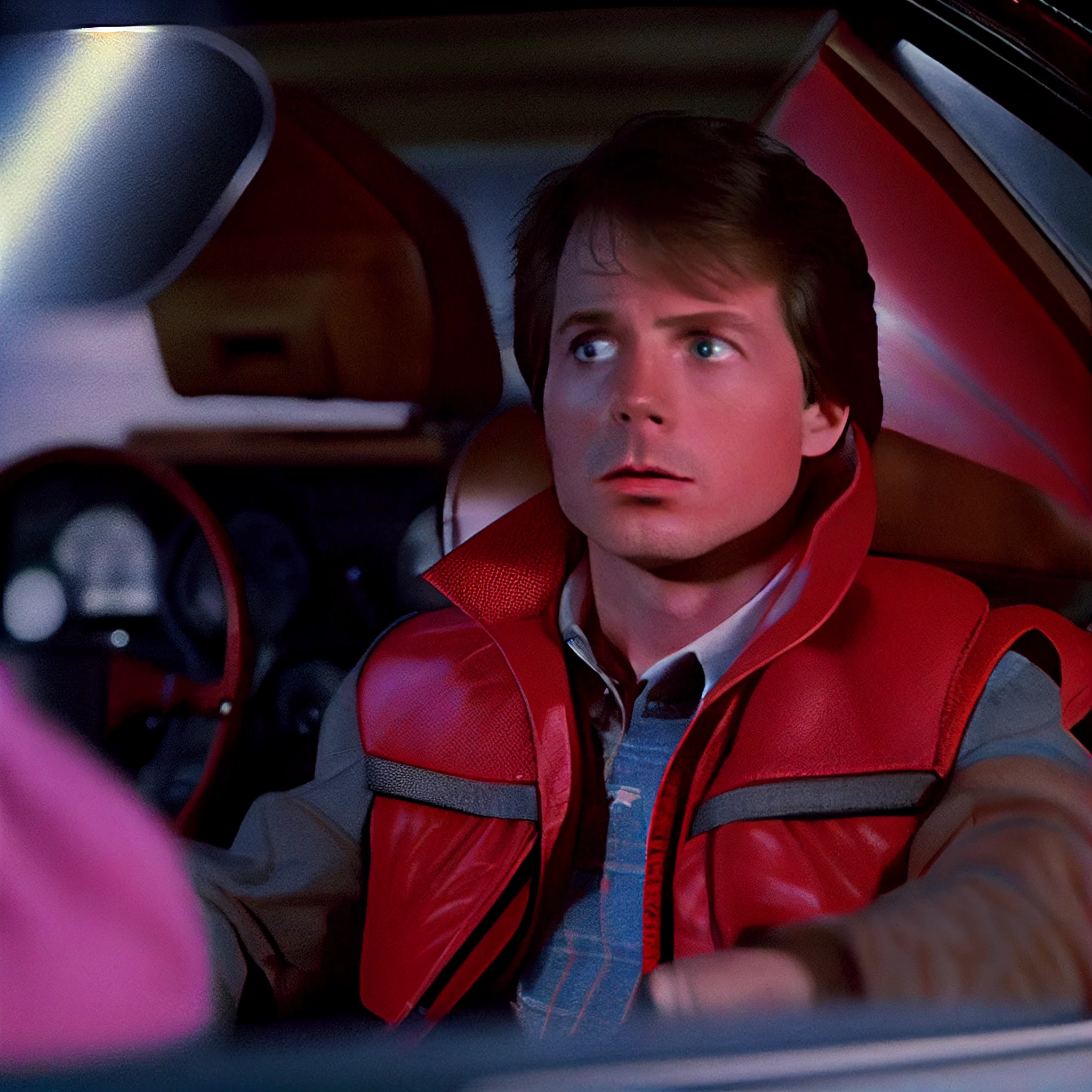 Michael J. Fox Back to the future movie lost scene, Dolorean, 4k, wide angle, red vest, sharp-focus, intricately-detailed, long exposure time, f/8, ISO 100, shutter-speed 1/125, diffuse-back-lighting, photographed by Dean Cundey, facing-camera, looking-into-camera, monovisions, elle, small-catchlight, low-contrast, High-sharpness, facial-symmetry, depth-of-field, golden-hour, ultra-detailed photography --v 4 --v 4 --q 2 --upbeta