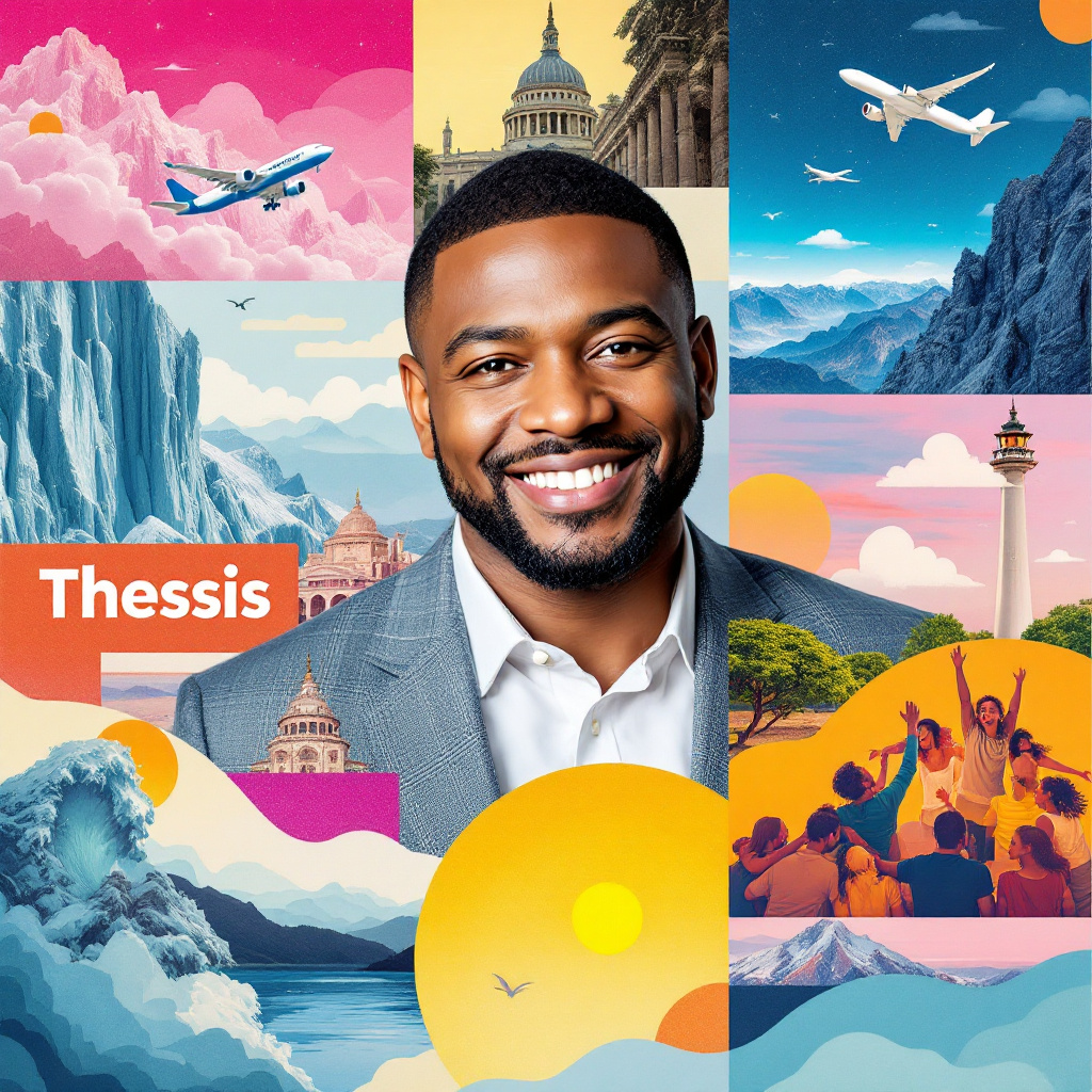 Create a vibrant, motivational collage-style poster that prominently features **Coach Leotis Hightower’s photo**. Blend visuals of **travel** (e.g., airplanes, landmarks), **family and friends** (people enjoying togetherness), **land** (lush scenery, symbolic landscapes), **power** (strong, uplifting imagery), and **happiness** (bright colors, smiling faces).
