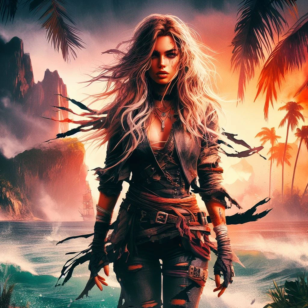 best quality, ultimate detailed, digital art illustration, a female badass pirate abandoned, lost alone on tropical desert island background, shredded fabrics, breathtaking beauty, key visual, vibrant colors, comprehensive cinematic, volumetric lightning