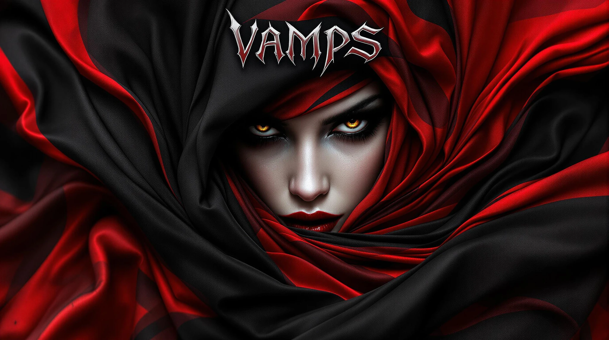 VAMPS horror magazine cover features a mesmerizing close up of woman wrapped in a red and black fabric. The fabric flows around, blending her figure into a dynamic, surreal pattern. Her face is severe and seductive, , the fabric, creating an otherworldly, ethereal look. The small size VAMPS logo in Gothic font at the top is metallic and striking against the abstract design.