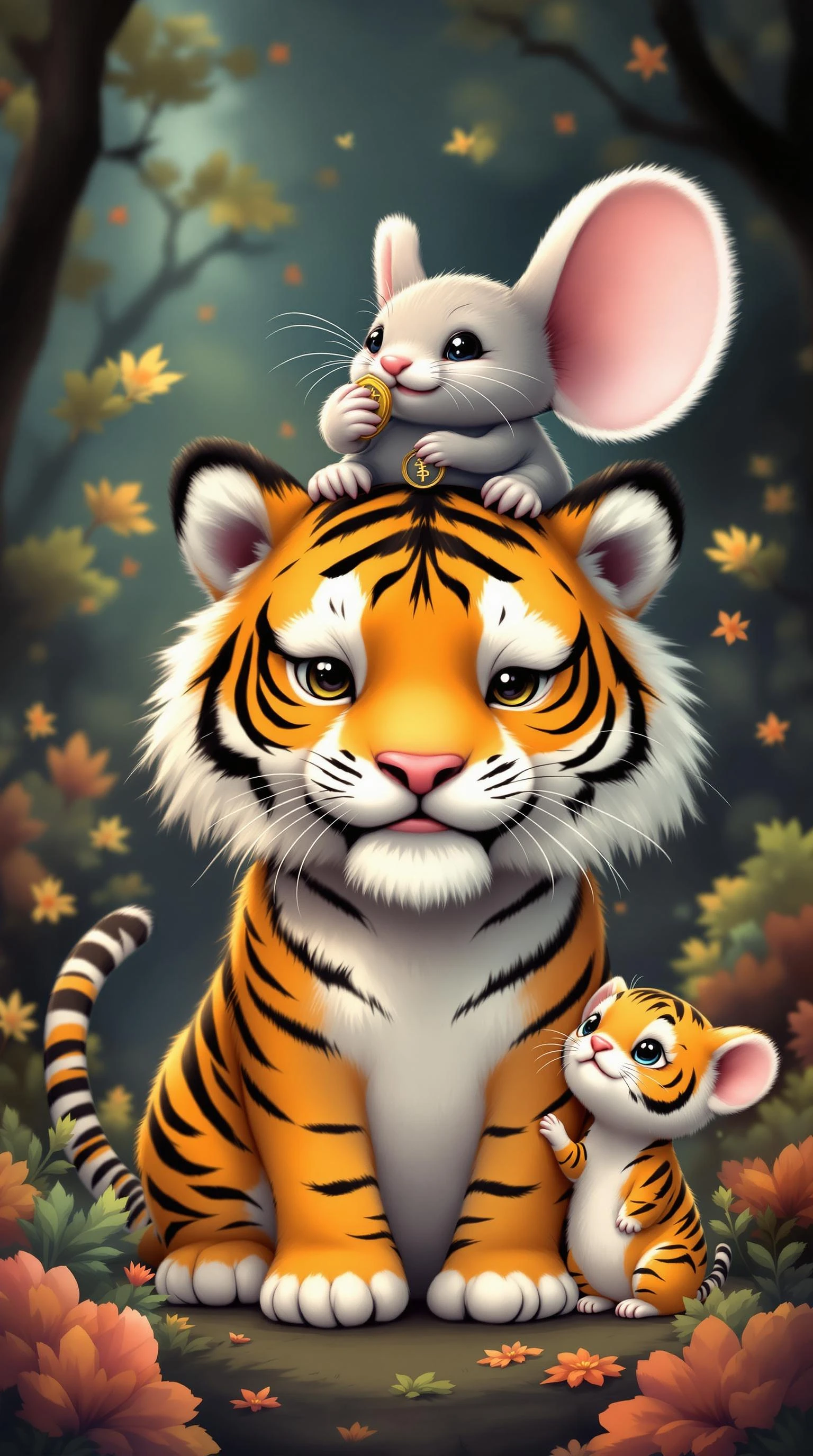 kawaii art, a tiger and two tiger cubs, and a oversized mouse , with a mouse on the tiger's head, the mouse holding a talisman,